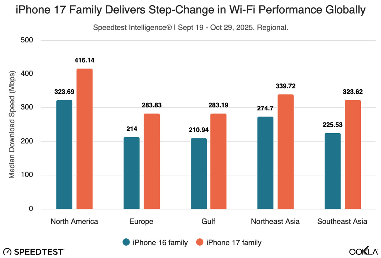 Apple fait une entrée plus que réussie dans le monde des puces Wi-Fi. D’après les mesures recueillies par Ookla via le service Speedtest, sa puce maison N1 améliore significativement les performances des iPhone 17 et iPhone Air par rapport aux iPhone 16 équipés en Broadcom. En réception comme en envoi, les débits progressent nettement, et ce dans tous les pays étudiés. À l’échelle mondiale, l’avantage tourne jusqu’à 40 % en faveur de la nouvelle puce.