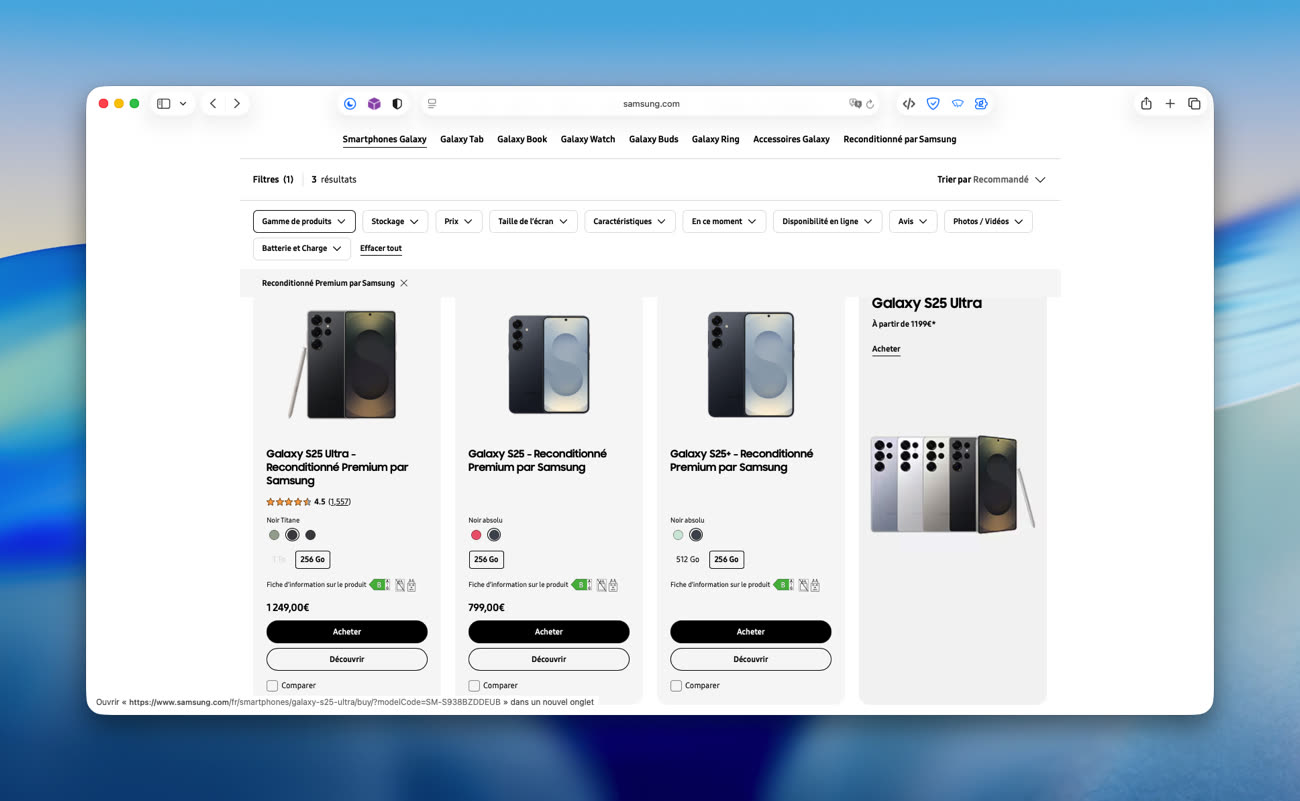 La boutique est disponible en ligne à ce lien. Avec 256 Go de stockage, le Galaxy S25 est vendu 799 € quand le S25 Ultra est à 1 249 € en reconditionné. À configuration égale sur le site de Samsung, le S25 est à 759 € et le S25 Ultra à 1 199 €. C’est respectivement 40 € et 50 € de moins en optant pour le téléphone neuf !