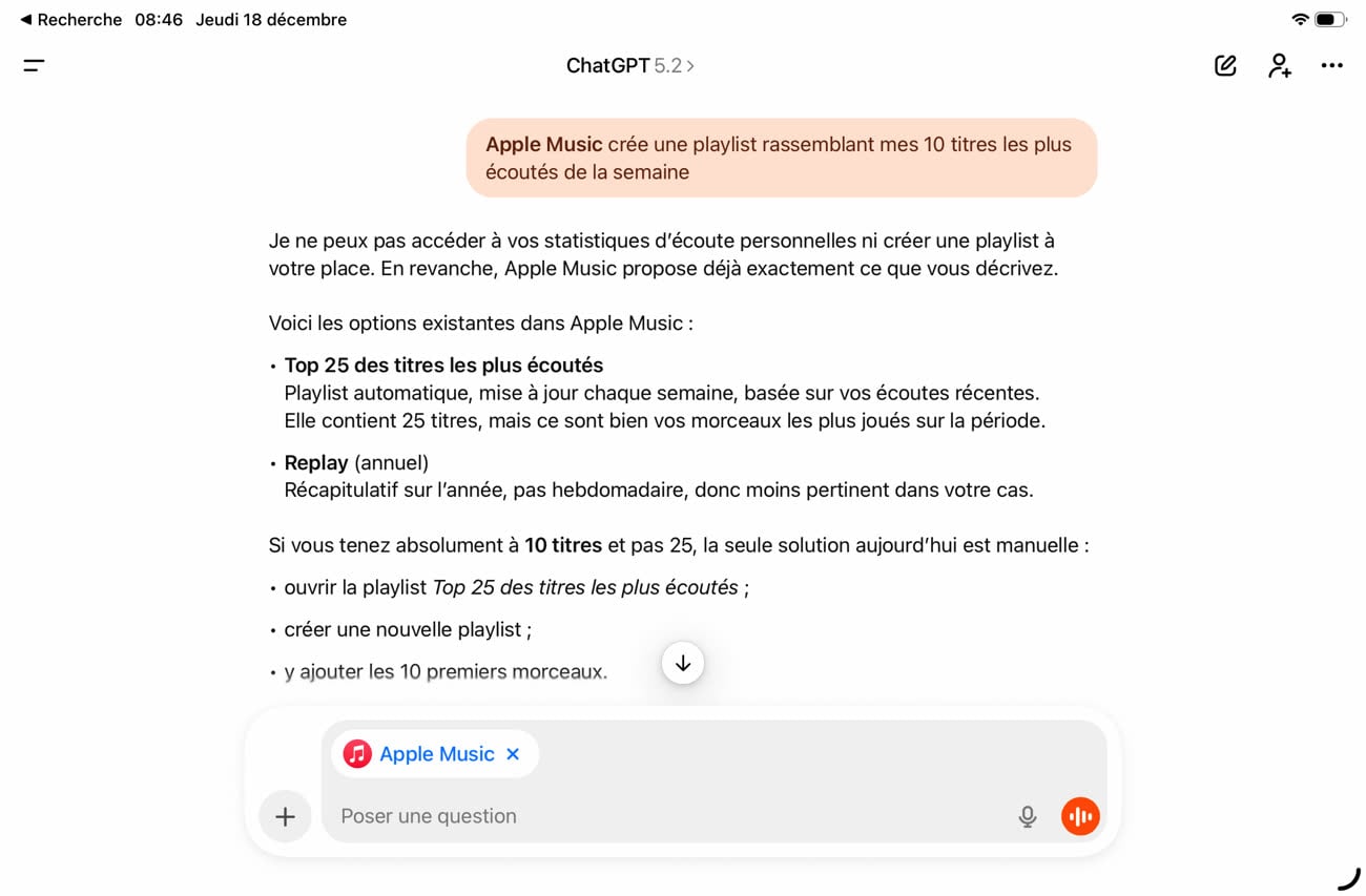 Même si vous autorisez OpenAI à accéder à votre compte Apple Music, les autorisations accordées sont plutôt restreintes dans ce cas. C’est probablement un choix de la part d’Apple et chaque développeur a toute latitude pour ajuster le curseur du partage de données avec le créateur de ChatGPT. En l’occurrence, l’intégration ne donne pas accès aux statistiques personnelles, si bien que le premier essai de Stéphane s’est traduit par un échec. En demandant une liste de lecture rassemblant les dix morceaux les plus écoutés cette semaine, le chatbot a indiqué qu’il ne pouvait pas accéder aux statistiques, avant de détailler la marche à suivre dans l’app Musique.