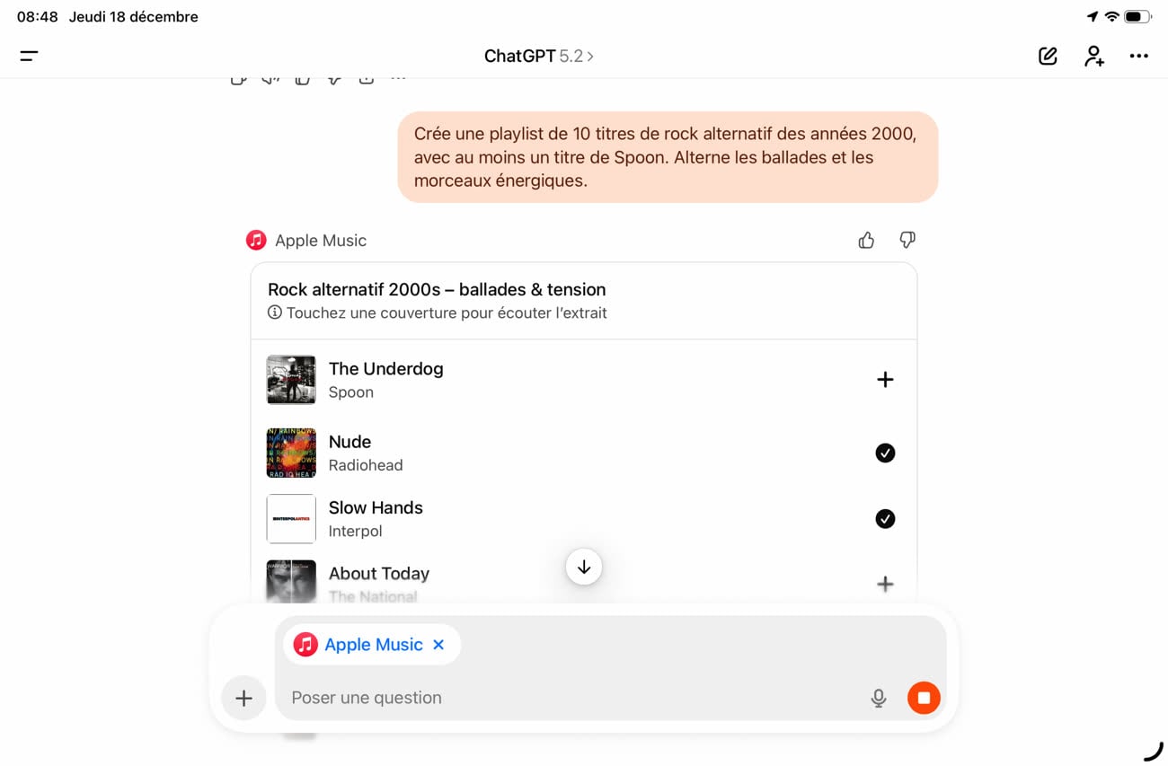 Comme toujours, ChatGPT n’hésite pas à guider l’utilisateur en faisant des suggestions. Une fois la liste de lecture créée, l’assistant a proposé à Stéphane de la modifier pour inclure des artistes moins connus ou alors pour modifier la tonalité générale vers une ambiance plus pop ou au contraire plus sombre. Ce ne sont pas des fonctionnalités prévues par Apple, c’est le grand modèle de langage sous-jacent qui prend ce genre d’initiatives.