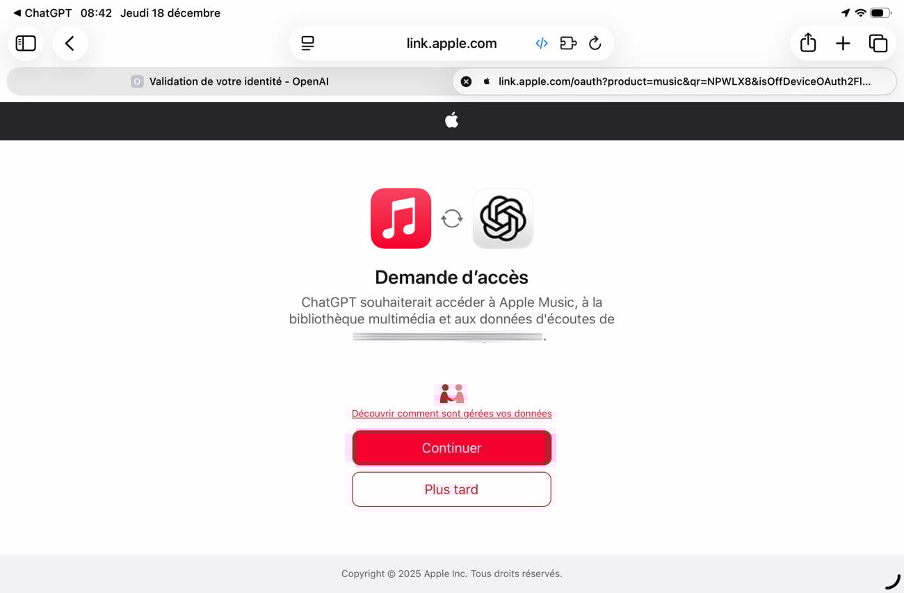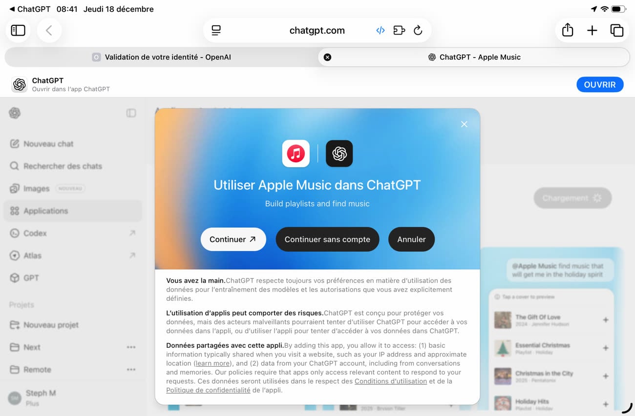 Mon collègue Stéphane a justement testé ce matin l’app dédiée à Apple Music pour se créer une liste de lecture. Précisons d’abord que la boutique est accessible depuis un navigateur web ou l’app iOS dédiée à ChatGPT, mais pas encore depuis celle du Mac. L’ajout du service de musique pommé se fait en se connectant, même s’il y a une option pour tester l’app sans compte qui présente assez peu d’intérêt1. C’est alors le site web d’Apple qui prend le relai pour vous permettre de saisir vos identifiants et valider l’accès à votre compte par OpenAI.