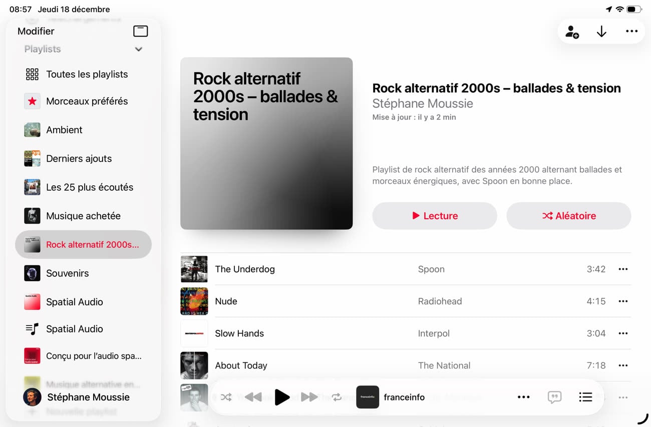 Mon collègue a en revanche réussi à créer une liste de lecture en donnant des critères qui ne dépendent pas de son compte, en l’occurrence une sélection de titres de rock alternatif des années 2000. Sa requête incluait quelques critères supplémentaires, comme la présence d’un artiste spécifique ou encore l’alternance entre des morceaux énervés et calmes et le résultat était satisfaisant. Une fois créée dans ChatGPT, cette liste de lecture a automatiquement été ajoutée à son compte, si bien qu’il a pu l’écouter dans l’app conçue par Apple. Le titre et même la description sont correctement remplis, il ne manque qu’une image d’illustration pour un résultat parfait.