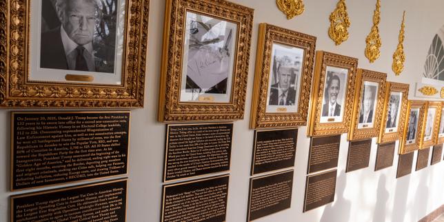 Quelques mois après avoir transformé un couloir de l’aile ouest de la Maison Blanche en ce qu’il appelle le « Presidential Walk of Fame », le président américain, Donald Trump, a ajouté des plaques descriptives à l’exposition, renforçant ainsi son empreinte sur l’esthétique du bâtiment et poursuivant ses efforts pour modeler l’histoire à sa guise en distribuant les bons et les mauvais points à ses prédécesseurs.