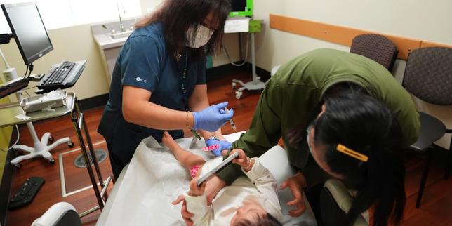Une assistante médicale administre un vaccin à une enfant âgée d’un an, tandis que sa mère détourne son attention, à l’International Community Health Services, à Seattle, le 10 septembre 2025.