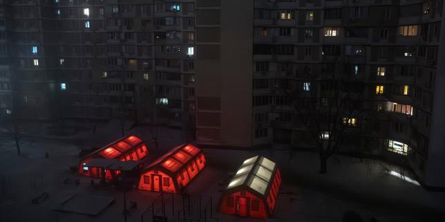 Des tentes alimentées par générateur au pied d’immeubles résidentiels impactés par les coupures de gaz et d’électricité, dues aux bombardements russes, permettent aux habitants de venir se réchauffer à Kiev, le 15 janvier 2025.
