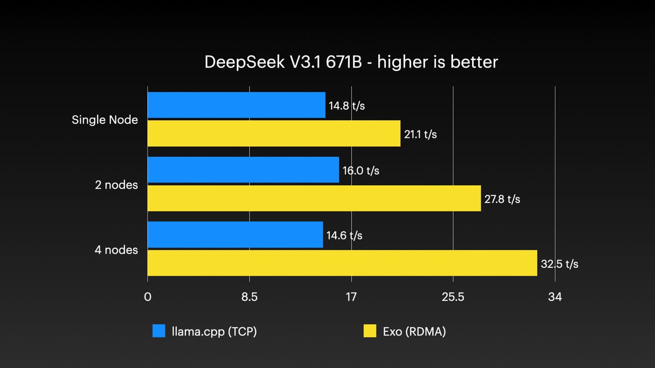 Avec l'activation du RDMA (qui nécessite un passage dans la partition de restauration, en ligne de commande), les gains peuvent être importants, comme il le montre. Avec des modèles de langage qui nécessitent plus que les 512 Go de RAM d'un Mac (il utilise Exo, un outil open source qui prend justement cette fonction en charge), c'est une solution pratique pour récupérer plus de mémoire. Bien évidemment, les logiciels doivent prendre en charge la possibilité de travailler en cluster. Sur un modèle avec 671 milliards de paramètres (DeepSeek V3.1), il est par exemple possible de passer de 21 à 32 tokens/s. C'est un gain qui n'est pas aussi élevé que l'investissement nécessaire pour quatre Mac Studio, mais qui reste assez intéressant.