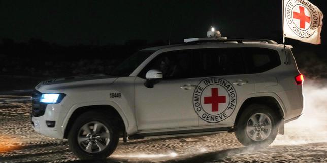Dans le centre de la bande de Gaza, un convoi de la Croix-Rouge transporte le corps d’une personne présumée être un otage décédé, remis par des militants palestiniens afin d’être rendu aux autorités israéliennes, le 7 novembre 2025.