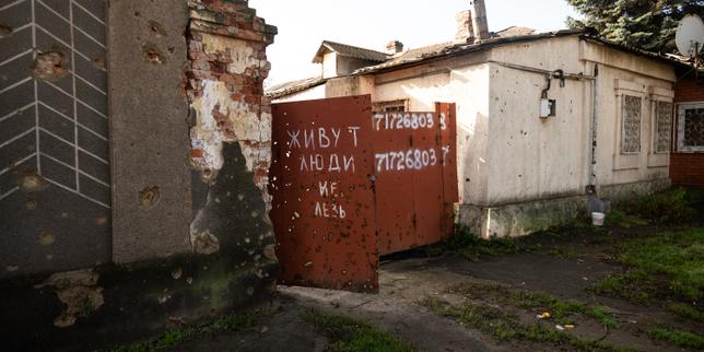 Des maisons détruites dans le centre de Marioupol, le 18 novembre 2025. Sur le portail est écrit : « Ici habité, défense d’entrer. » Pendant la guerre, de nombreux habitants s’étaient réfugiés chez eux et leurs maisons ont servi de bases arrière lors de la retraite de l’armée ukrainienne. Elles ont ensuite été pillées par les forces russes à la recherche de soldats ennemis.