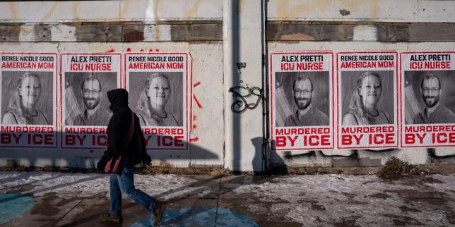 Des affiches rendant hommage à Renee Nicole Good et Alex Pretti, tués par des agents fédéraux de l’immigration, à Minneapolis (Minnesota), le 29 janvier 2026.