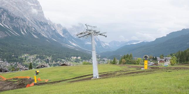 Le téléphérique Appolonia Socrepes dans le domaine skiable de Tofana, nouvellement équipée de canons à neige. Hors cadre, la fissure qui s’est ouverte dans la pente sujette aux glissements de terrain. A l’arrière-plan, le sommet des Sorapiss et le mont Antelao, à Cortina d’Ampezzo (Italie), le 23 septembre 2025.