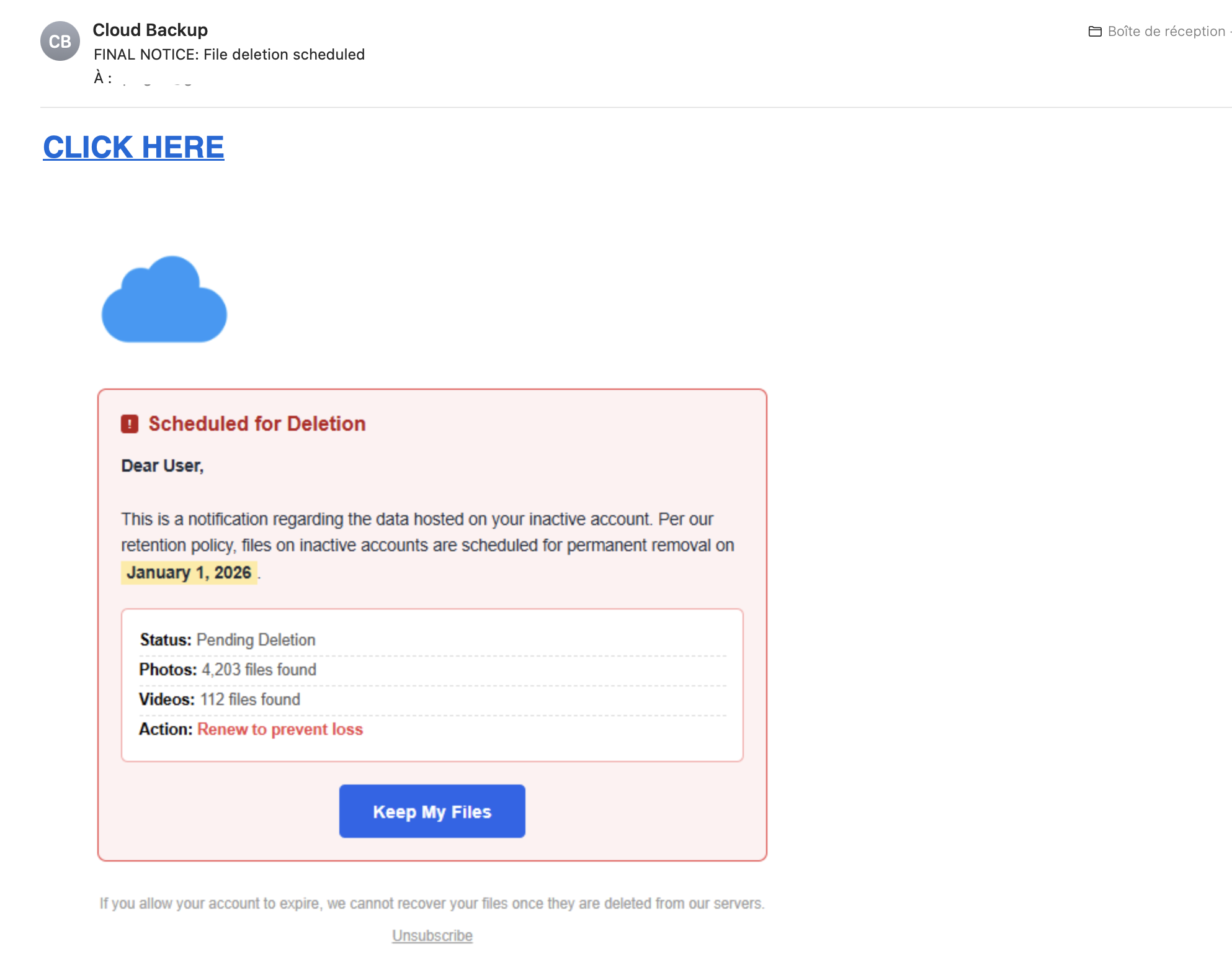 Il y a plusieurs problèmes: "FINAL NOTICE: File deletion scheduled", "CLICK HERE" en gros gras et souligné, l'indication que des fichiers vont être effacés, et puis le beau bouton "call to action" qui indique "Keep My Files".