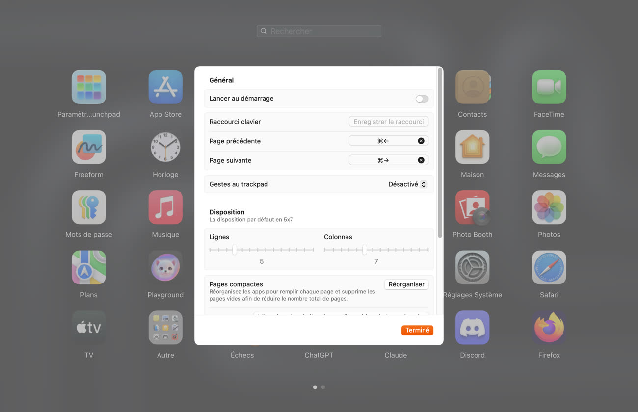 Les options de personnalisation vont également au-delà de ce que proposait le Launchpad natif. Contrairement à la grille rigide imposée par Apple et reprise par ses concurrents, BuhoLaunchpad laisse définir librement le nombre d'applications par ligne et par colonne. Vue compacte avec davantage d'icônes, ou disposition aérée pour plus de lisibilité : chacun compose sa propre mosaïque. Les raccourcis clavier configurables complètent l'arsenal pour ceux qui préfèrent éviter le trackpad.