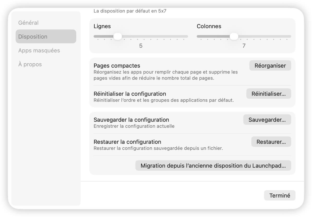 L'autre différence majeure réside dans la migration. Tous ceux qui ont mis à jour vers macOS Tahoe se sont heurtés au même problème : des années d'organisation perdues en un instant. Les dossiers thématiques patiemment constitués, les applications rangées par usage, tout ce travail volatilisé. BuhoLaunchpad intègre un système d'importation qui récupère la disposition précédente dans son intégralité. Dossiers, contenu, pages multiples : tout réapparaît. LaunchNow et Launchie ne proposent pas cette récupération exhaustive des configurations antérieures du Launchpad natif.