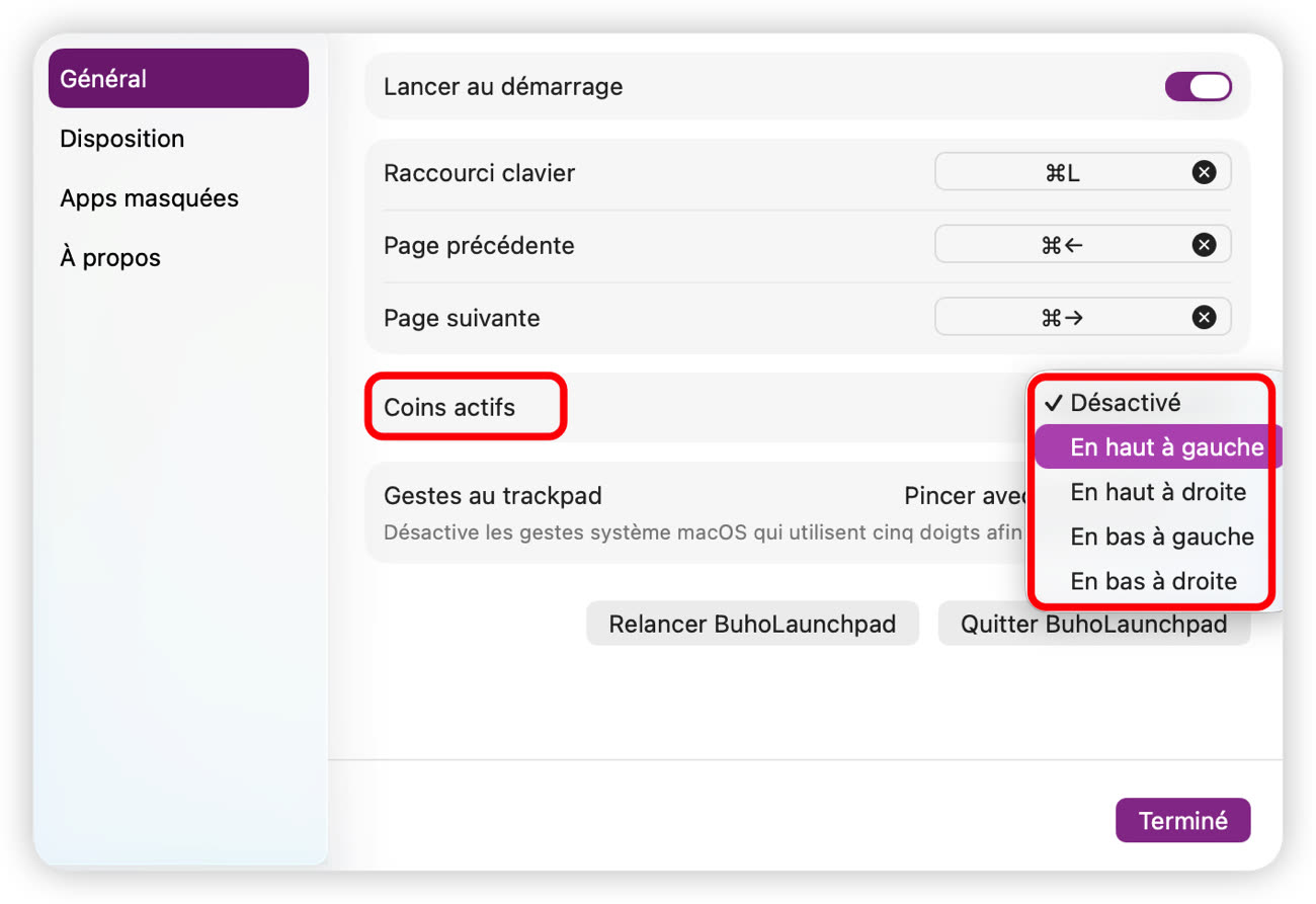 Là où le geste à quatre doigts tentait de remplacer Launchpad, les Coins actifs transforment désormais les bords de l'écran en véritables déclencheurs. Vous pouvez assigner l'un des quatre coins pour afficher instantanément la grille d'applications. Un simple mouvement du curseur suffit : plus besoin de raccourci clavier, l'accès devient immédiat et intuitif.