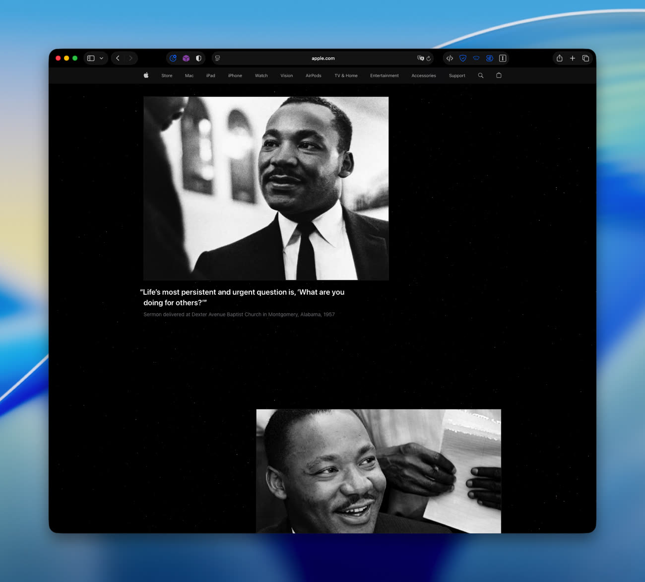 La page est ornée de photos accompagnées de citations. On y trouve aussi un lien vers un podcast animé par Bernice A. King, ainsi qu’un lien pour acheter un livre revenant sur les travaux de son père. Tim Cook a déjà dit son admiration pour Martin Luther King, et cite aussi régulièrement Robert F. Kennedy.